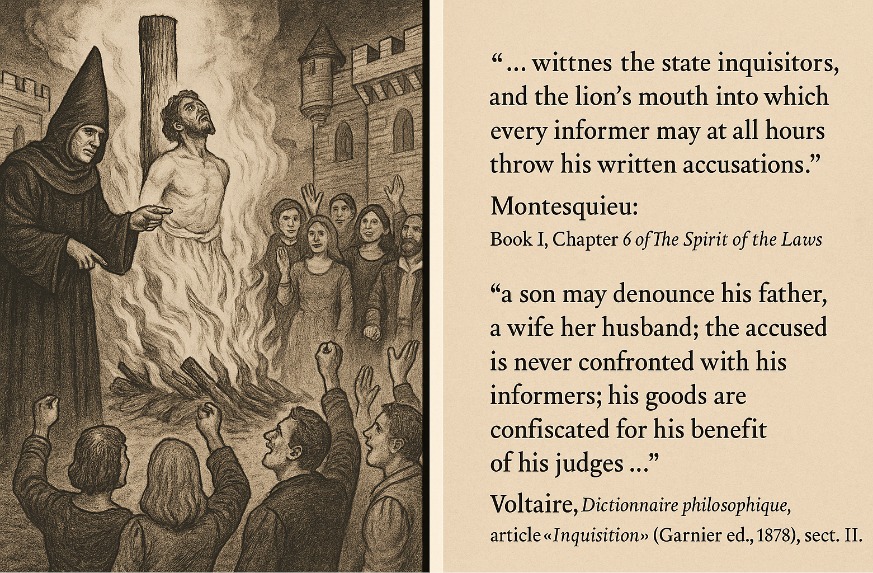 Juan Antonio Llorente, who served as secretary of the Inquisition and later wrote its critical history, warned that anonymous accusations “allowed private enemies to disguise their resentment as zeal for the faith, and turned the Inquisition into an instrument of private vengeance.” Montesquieu summed it up in The Spirit of the Laws: “… witness the state inquisitors, and the lion’s mouth into which every informer may at all hours throw his written accusations.” Voltaire was equally blunt: “a son may denounce his father, a wife her husband; the accused is never confronted with his informers; his goods are confiscated for the benefit of his judges …”.