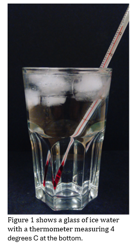 All matter shrinks when cooled, resulting in an increase in density. Therefore, one would expect water to have a high density at its freezing point. However, as we all know, ice cubes float, so everything is upside down when we look at a glass of ice water (Fig. 1). Strangely enough for the liquid state, water is the densest at 4 degrees C, and therefore it stays on the bottom whether it’s in a glass or in an ocean. If you chill water below 4 degrees, it starts to expand again. If you continue to cool pure water (where the rate of crystallization is low) to below 0 degrees, it continues to expand – the expansion even speeds up when it gets colder.